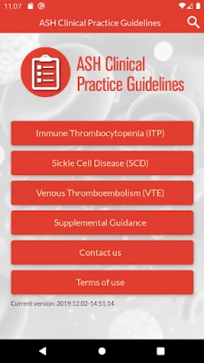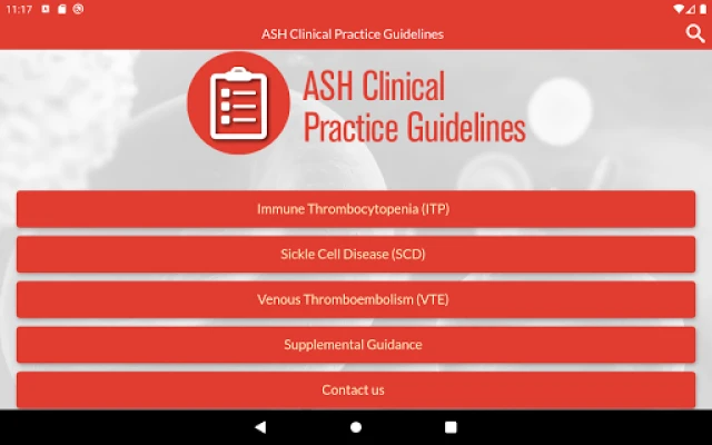 The ASH Practice Guidelines app provides easy access to every recommendation from all guidelines published by the American Society of Hematology (ASH), including rational for each recommendation and benefits and harms associated with each recommended course of action. The app currently includes guidelines covering venous thromboembolism (VTE), sickle cell anemia (SCD), and immune thrombocytopenia (ITP). The app also provides access to other tools and resources designed to aid in clinical decision-making, including links to the published guideline manuscripts, ASH Choosing Wisely lists, the ASH Consult a Colleague program, and the ASH Pocket Guides app.