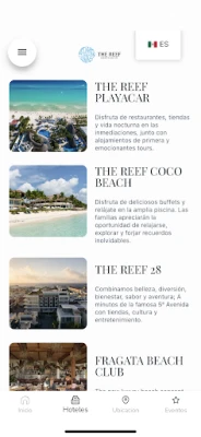 The Reef Resorts es tu acceso exclusivo a todos los servicios y experiencias que ofrecemos en nuestros hoteles. Con nuestra app, puedes explorar cada uno de nuestros hoteles y descubrir todos los servicios disponibles, desde restaurantes con sus menús detallados hasta eventos especiales y recorridos virtuales en 360 grados. Además, la aplicación te facilita cómo llegar a nuestras ubicaciones, asegurando que tengas toda la información que necesitas para una estancia inolvidable. Sumérgete en el lujo y la comodidad de The Reef Resorts y haz que tu próxima visita sea aún más especial.