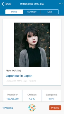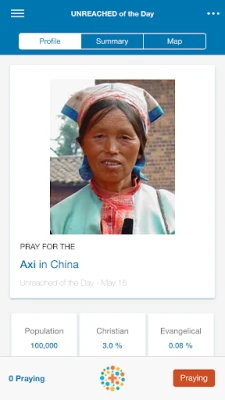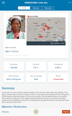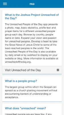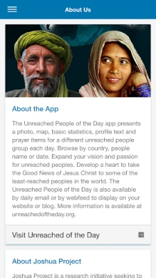 The Unreached People of the Day app presents a photo, map, basic statistics, profile text and prayer items for a different unreached people group each day. Browse by country, people name or date. Expand your vision and passion for unreached peoples. Develop a heart to take the Good News of Jesus Christ to some of the least-reached peoples in the world.